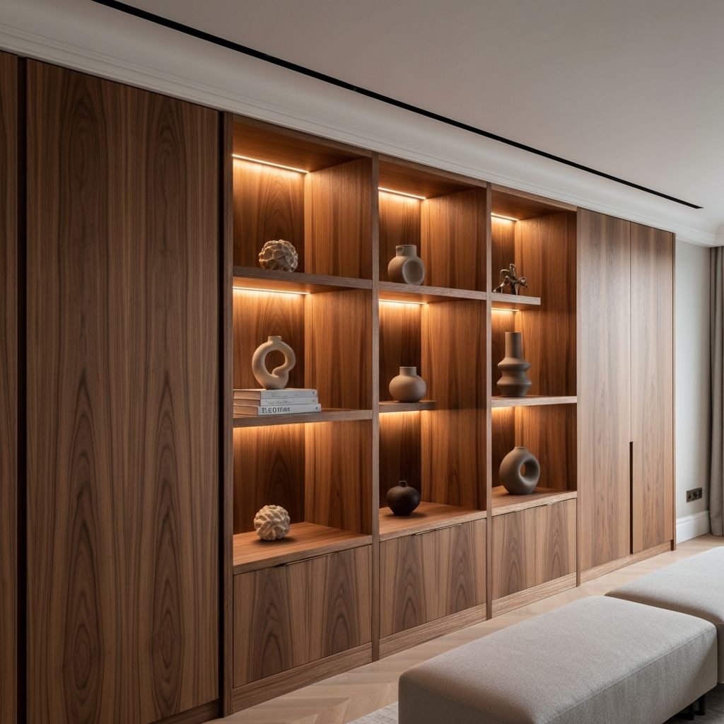 Mobilier intégré, bibliothèques murales sol-plafond, habillages de cheminée, niches rétroéclairées et agencement d'espaces de vie. Nos réalisations transforment les murs vides en éléments architecturaux qui donnent du caractère et de la fonctionnalité à chaque pièce. Chaque projet est dessiné sur plan, validé avec vous, puis fabriqué et posé par nos artisans.